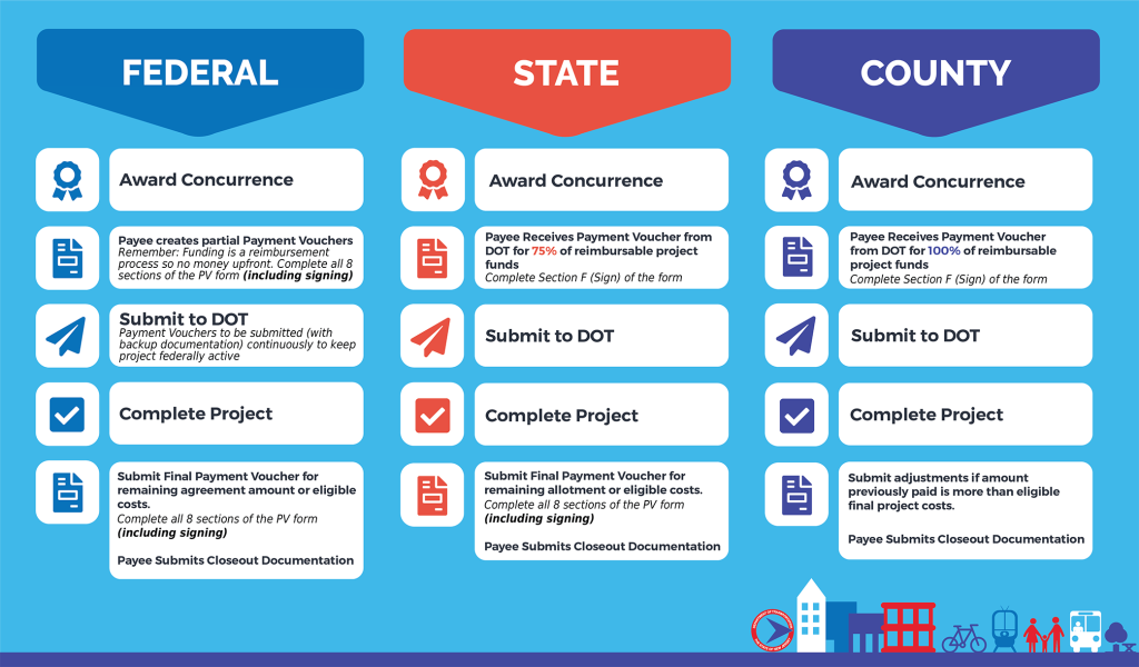 Instructions provided here are intended to improve the invoicing process and ensure greater efficiency in processing payments. The Payment Voucher (PV) is used for all federal aid, state aid, and county aid project invoicing. There are different payment processes for each program, however, the same PV is used for all. Invoicing the DOT for payments also includes providing additional documents when submitting the PV. An incomplete PV and missing documents will result in delayed payment.